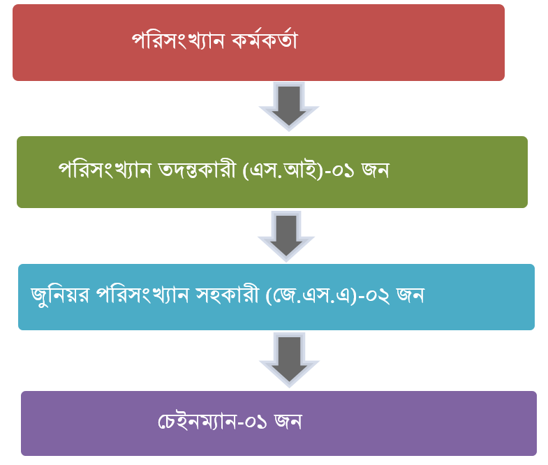 বাংলাদেশের জাতীয় পরিসংখ্যান সংস্থা হিসেবে বাংলাদেশ পরিসংখ্যান ব্যুরো (বিবিএস) ১৯৭৪ সালে প্রতিষ্ঠিত হয়। বাংলাদেশ পরিসংখ্যান ব্যুরো তার কাজকর্ম বাস্তবায়নের জন্য ঢাকা হেড অফিসসহ মাঠ পর্যায়ের বিভাগীয়, জেলা ও উপজেলা/মেট্টোপলিটন থানা পর্যায়ের অফিসগুলোর নেটওয়ার্ক স্থাপন করেছে। বর্তমানে বাংলাদেশের ০৮টি বিভাগে ০৮টি বিভাগীয় পরিসংখ্যান অফিস, ৬৪টি জেলায় ৬৪টি জেলা পরিসংখ্যান অফিস, ৪৮৩টি উপজেলা এবং ৬৯টি মেট্টোপলিটন থানা পরিসংখ্যান অফিসের শাখা বিস্তৃত। ঝিনইগাতী উপজেলা পরিসংখ্যান কার্যালয়ের সাংগঠনিক কাঠামোটি পেতে সংযুক্ত ফাইলটি ডাউনলোড করুন: